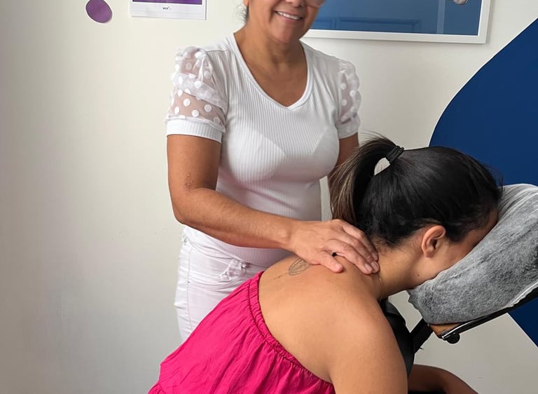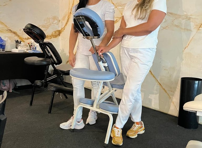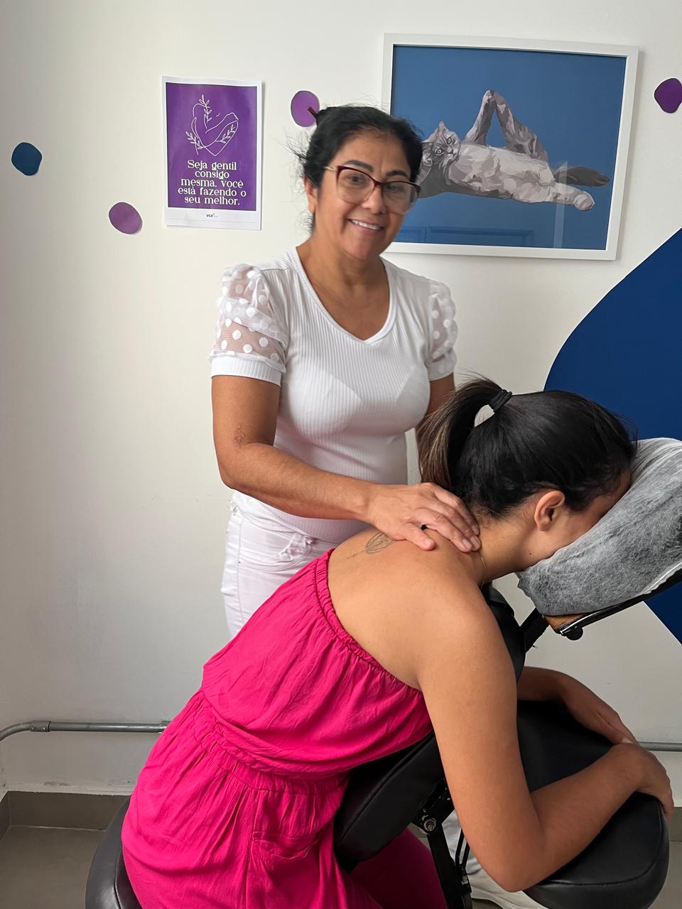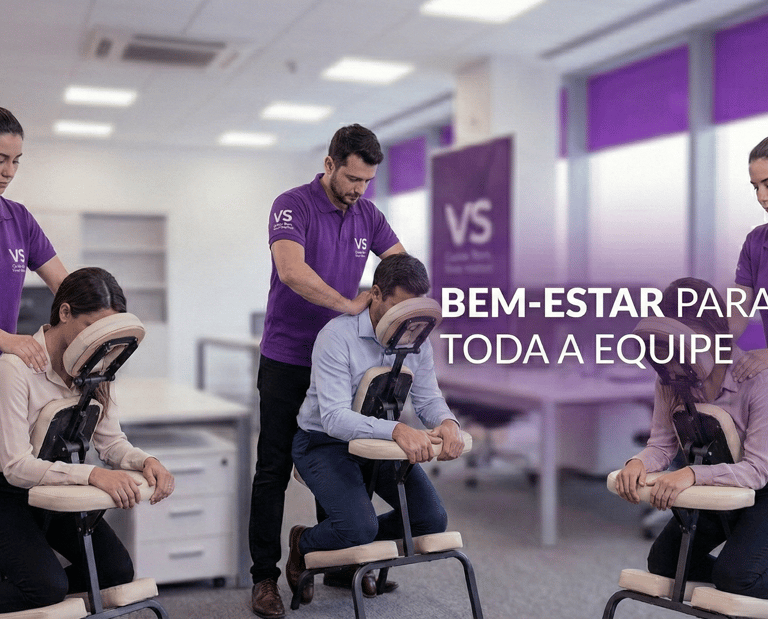 Sessões rápidas (15min) em cadeira ergonômica para alívio imediato de tensão muscular no escritório.